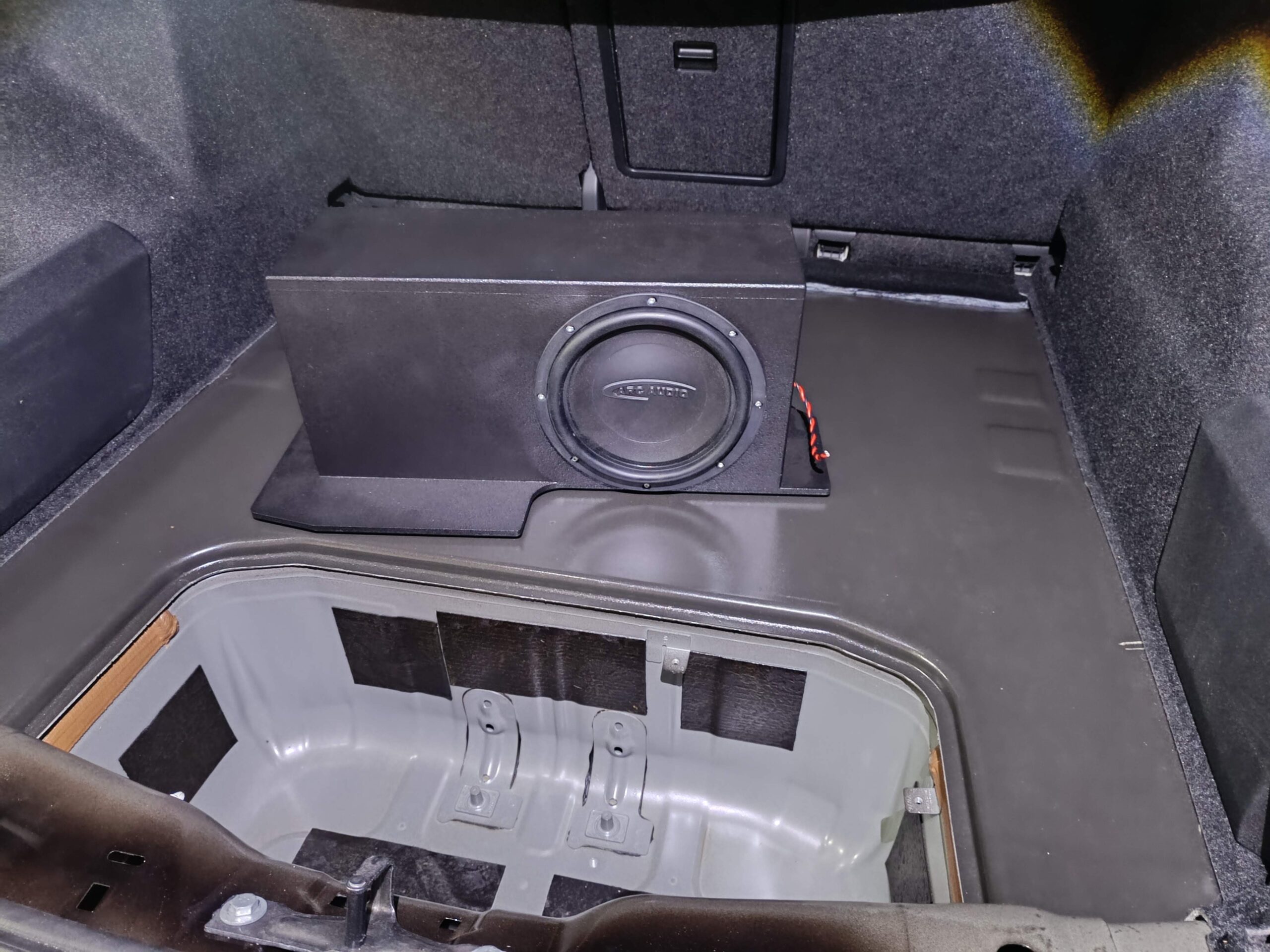 Die hinteren Lautsprecher durften, wie meistens, Serie bleiben. An dieser Stelle muss man erwähnen, dass die beim Skoda Enyaq Soundpaket erstaunlich gut ausgelegt sind und auch ohne zusätzlicher Dämmung durchaus brauchbar bis 60-70 Hz runterspielen können. Wer jetzt auf die Idee kommt, dass man sich ja den Woofer sparen könnte und nur mit dem Match-Verstärker auf Serienlautsprecher schon brauchbare Ergebnisse erreicht, liegt leider falsch.